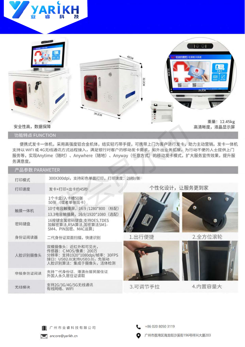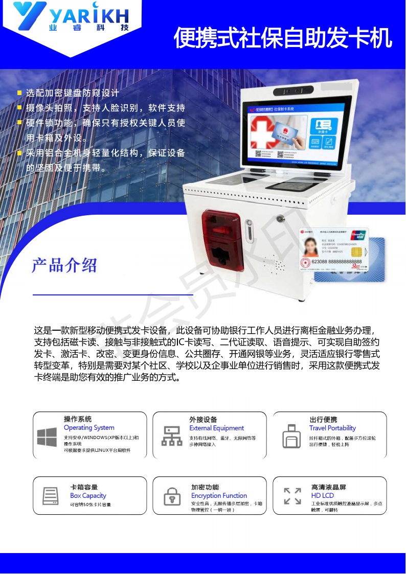 新型移動便攜式發卡設備,此設備可以協助銀行工作人員進行離柜金融業務辦理。包括磁卡讀取,接觸與非接觸式樣IC卡讀寫,二代證讀取,語音提示,可實現自助簽約發卡,激活卡,改密,變更身份信息,公共圈存,開通網銀等業務。